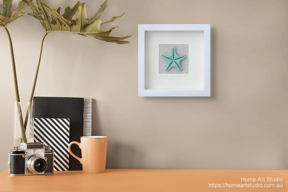 Green Resin Starfish shadow box wall art for modern home decor. Featuring Green starfish. Approximate artwork size 22 x 22 x 3cm (width x height x depth). Comes ready to hang with one sawtooth hanger.