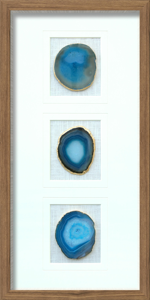 This shadow box wall art features triple blue agate in gold and is designed to add calm, layered texture to your space.
